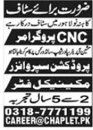 Private Company jobs advertisement dated about 18 August 2024 in daily Jang Newspaper invites application for the vacant post of cnc programmer, production supervisor and mechanical fitter in Lahore, lahore Punjab Pakistan. Candidates with Primary, Middle and Matric etc. educational background will be preferred.