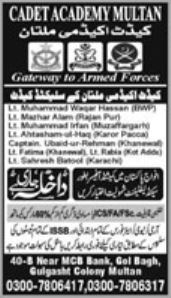 Cadet Academy Multan FA, FSc ICS admissions 2023 has been started. Eligible students who qualify as per admission criteria in Cadet Academy Multan Multan Punjab Pakistan can apply in Science College for academic year 2023. Students who want to enroll for academic session 2023 in ICS and Intermediate qualification and admission criteria for Private institute can apply till last date 7 June 2023. Read newspaper ad for exact details.
