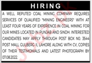 Coal Mining Company invites applications for job positions advertised in daily Jang dated 31 July 2022 for following vacancies in Lahore, lahore Punjab Pakistan.