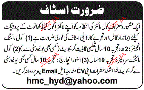 Coal Mining Engineer, Store Incharge Job Opportunity