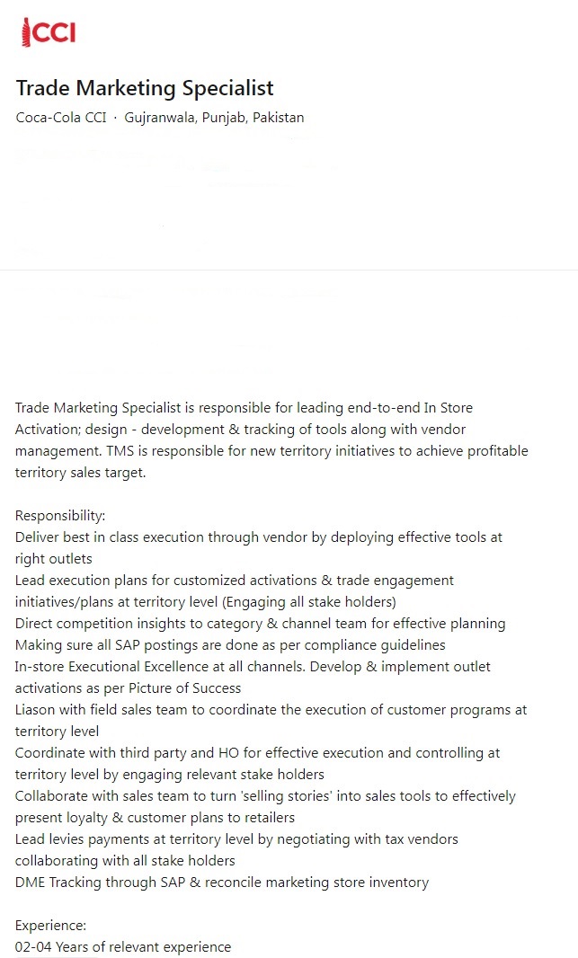 Original Source: https://pk.linkedin.com/jobs/view/trade-marketing-specialist-at-coca-cola-cci-3420544842?refId=8Kf53yXEv%2Bf%2BppUYemr1RQ%3D%3D&trackingId=ADagf0eFInDuGhCKojSCmw%3D%3D&trk=public_jobs_topcard-title
