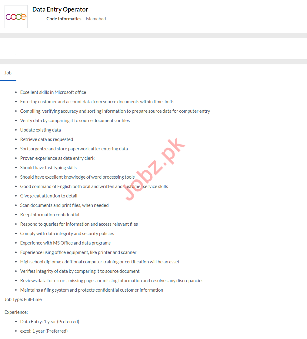 Code Informatics Islamabad Jobs 2020 Data Entry Operator