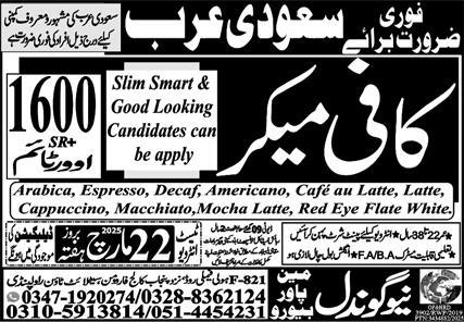 New Gondal Manpower Bureau Riyadh, jeddah Saudi Arabia invites applications from eligible candidates for the post of coffee maker as per advertisement of March 20, 2025 published in daily Express Newspaper. Candidates with Matric and Intermediate etc. educational background will be preferred.