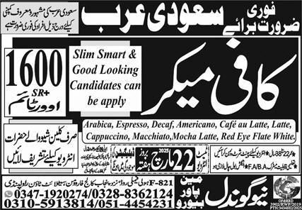 Vacant posts including coffee maker are announced in MS New Gondal Manpower Bureau OEP Riyadh, jeddah Saudi Arabia as per 21 March 2025 advertisement in daily Express Newspaper. Matric and Intermediate etc. educational qualification will be preferred.
