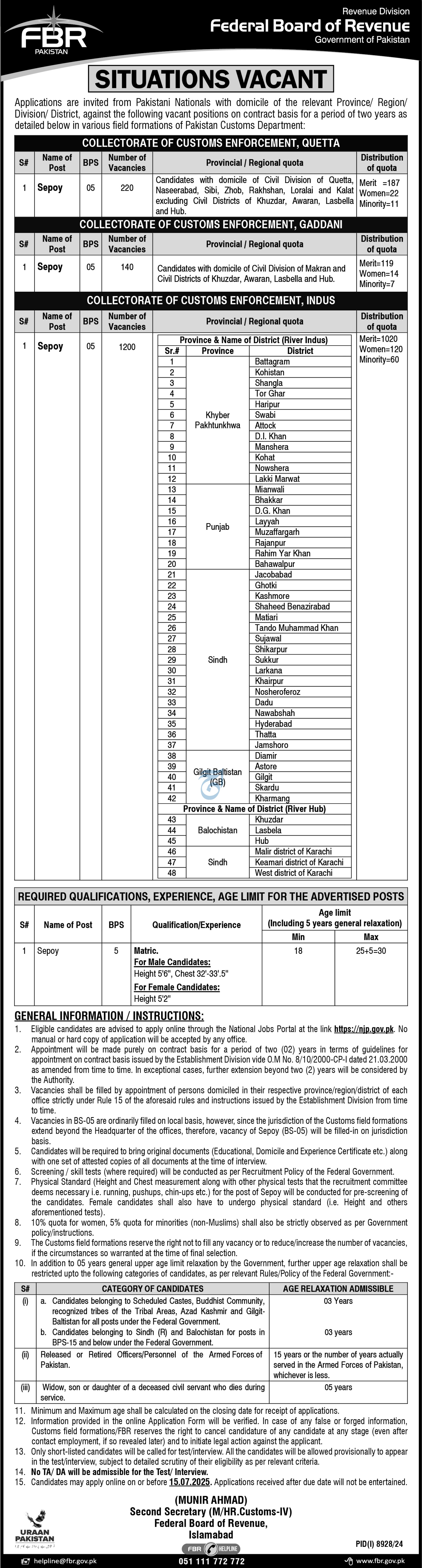 Collectorate Of Customs Enforcement FBR Jobs 2025 For Sepoy