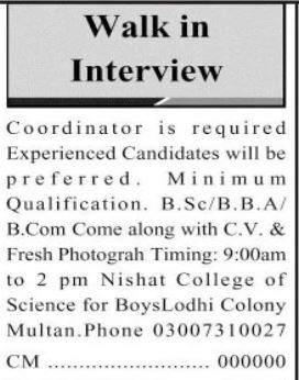 Nishat College of Science jobs advertisement dated about 30 January 2022 in daily Jang Newspaper invites application for the vacant post of coordinator in Multan Punjab Pakistan. Educational qualifications required Bachelor and Master etc.