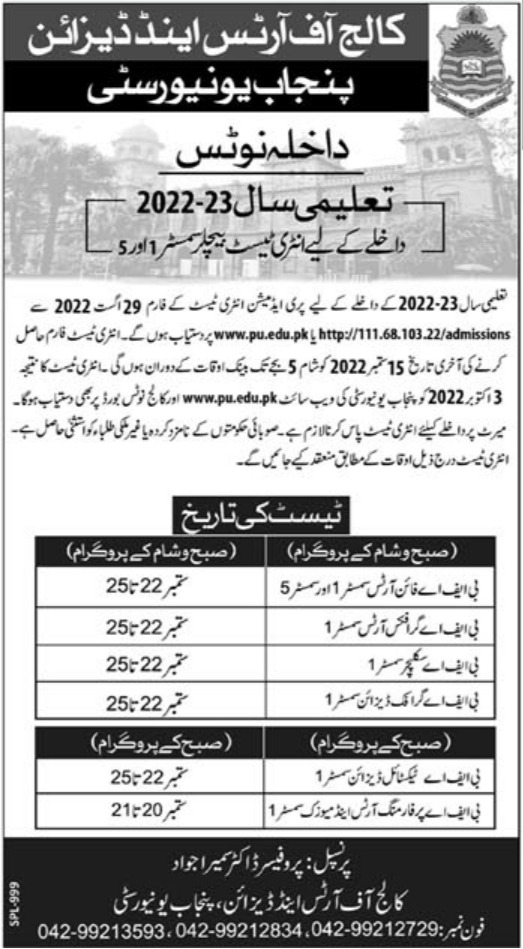 College of Arts and Design Punjab University Bachelor Admissions 2022 23