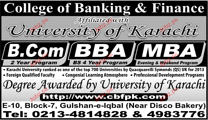 College of Banking and Finance Admission in BCom, BBA and M in Karachi Read newspaper ad for exact details.