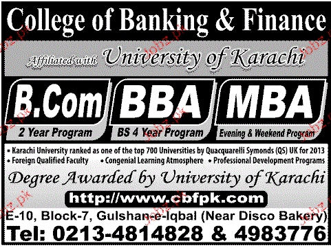 College of Banking and Finance Admission in BCom, BBA and M.Com in Karachi Read newspaper ad for exact details.