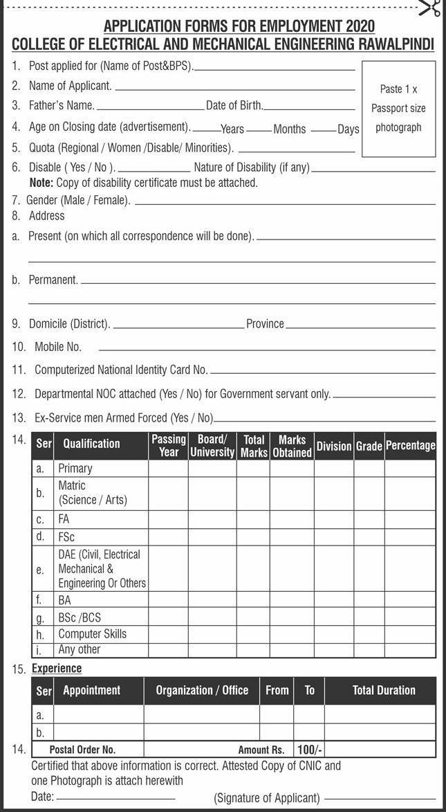Vacancies in College of Electrical & Mechanical Engineering Advertisement April 2020