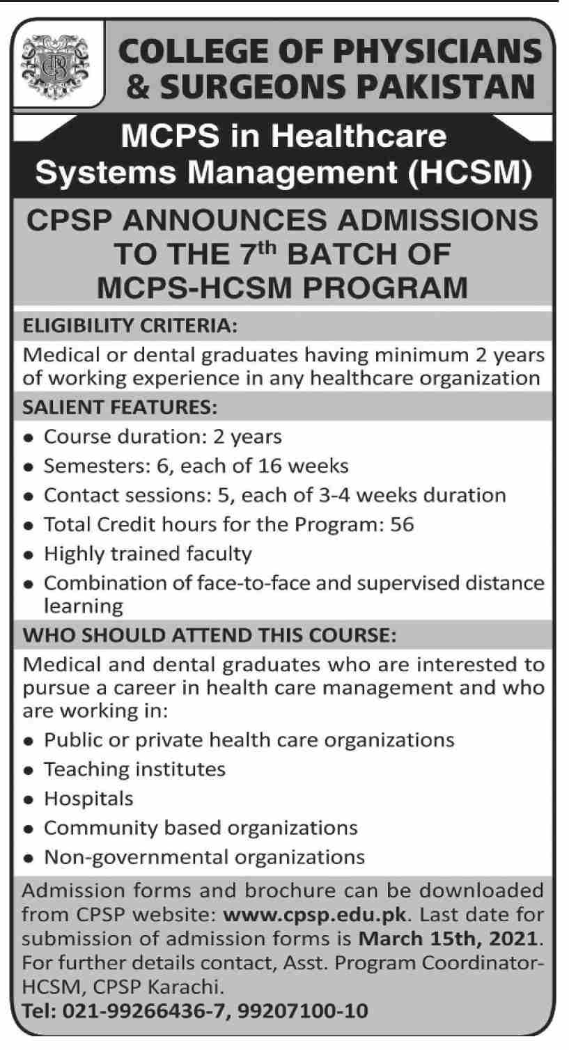College of Physician & Surgeons Pakistan CPSP has announced admissions to the 7th Batch of MCPS in Healthcare Systems Management HCSM Program in Karachi 2021. Read newspaper ad for exact details.