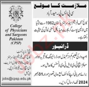 Latest Driving jobs and others Government jobs in College of Physician and Surgeons Pakistan CPSP closing date is around December 31, 2024, see exact from ad. Read complete ad online to know how to apply on latest College of Physician and Surgeons Pakistan CPSP job opportunities.