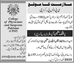 Vacant posts including printing machine operator are announced in College of Physicians and Surgeons Pakistan D.H.A Karachi, karachi Sindh Pakistan as per 2 March 2025 advertisement in daily Jang Newspaper. Persons with Intermediate etc. education can apply.
