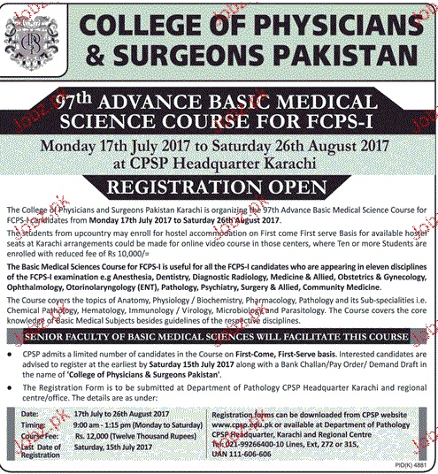 College of Physicians & Srgeons Pakistan Admission in FCPS-I in Karachi. Read newspaper ad for exact details.