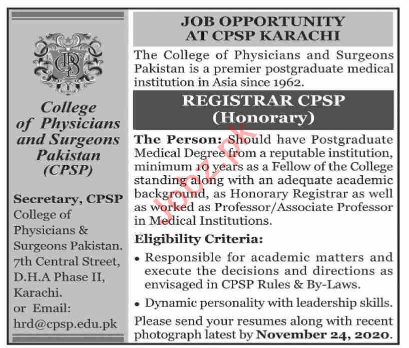 Vacancies in College of Physician and Surgeons Pakistan CPSP Advertisement November 2020