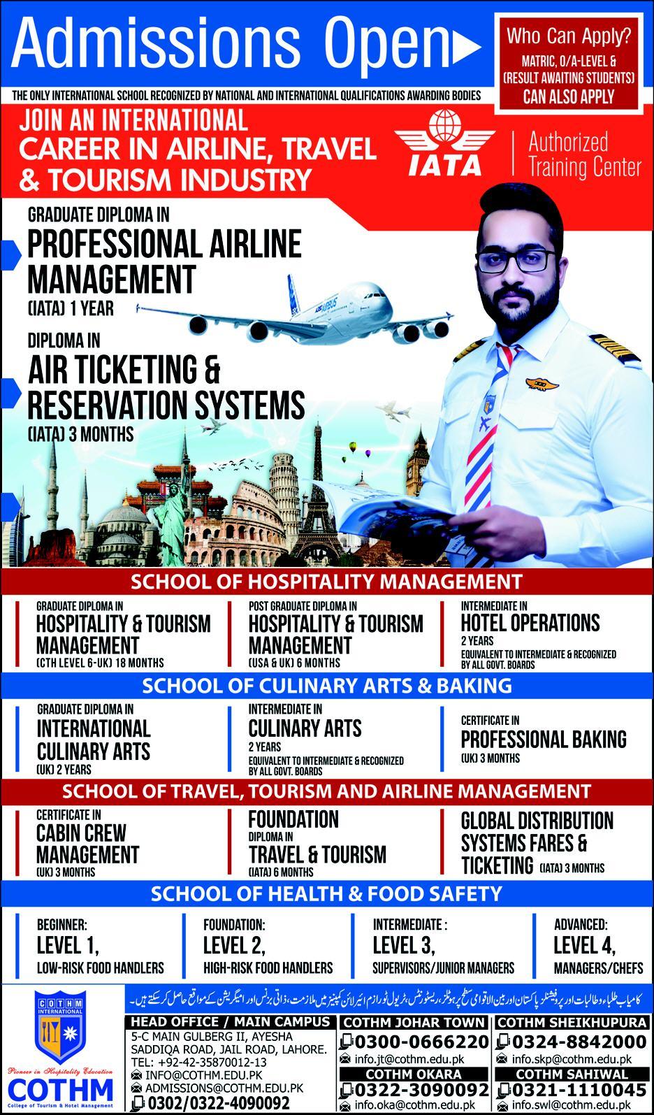 College of Tourism and Hotel Management Admission in PGD in Hospitality & Tourism Management, Diploma in Hotel Operations and Culinary Arts in Sahiwal. Read newspaper ad for exact details.