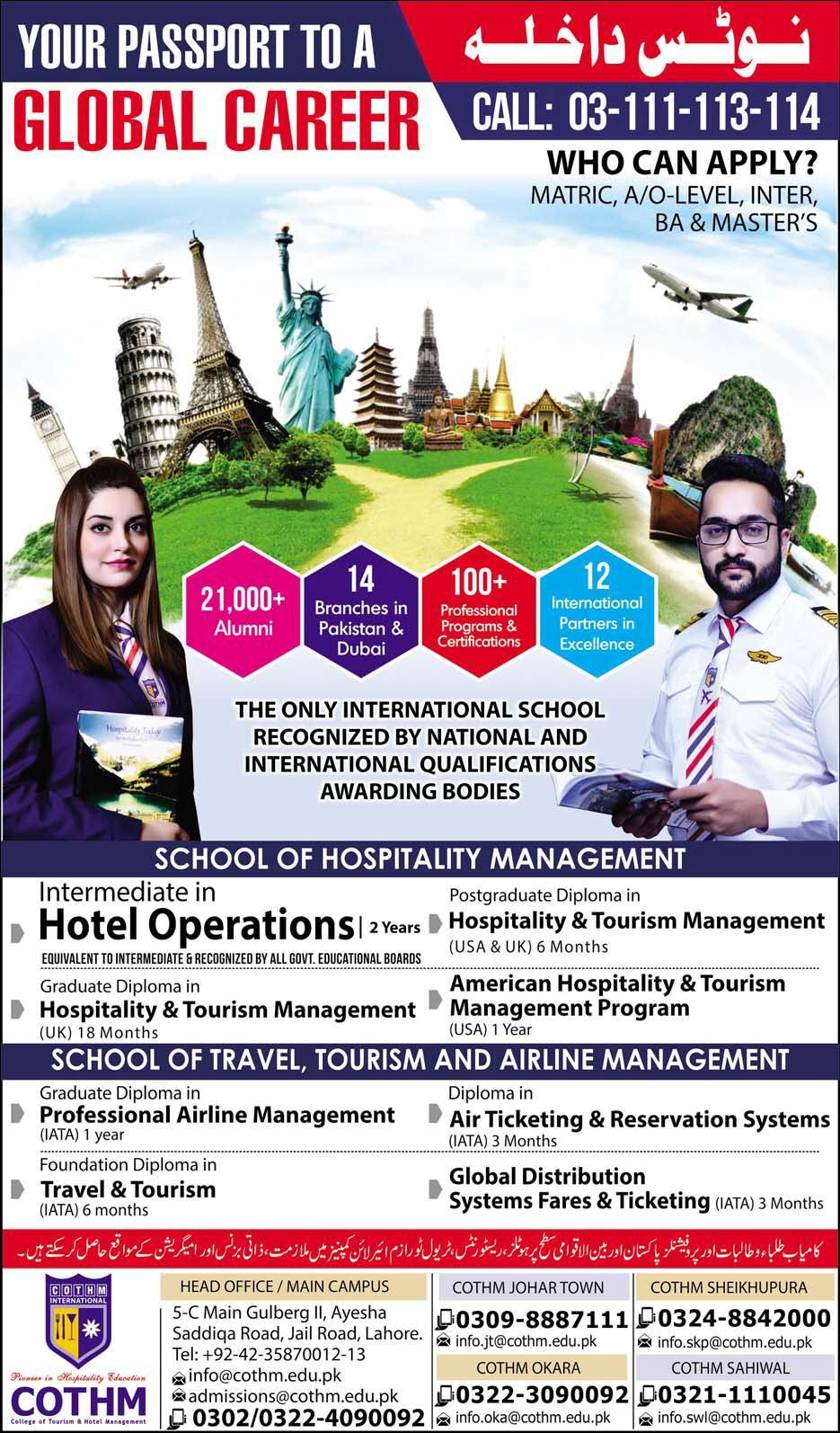 College of Tourism and Hotel Management Admission Intermediate in Hotel Operations, PGD in Hospitality & Tourism Management and Air Line Management in Lahore. Read newspaper ad for exact details.