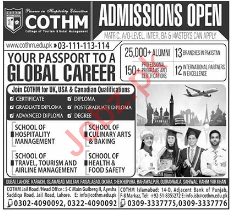 College of Tourism and Hotel Management COTHM is offering admissions for Certificate, Diploma, Graduate Diploma, Postgraduate Diploma and Degree in United Kingdom UK, United States of America USA & Canada. Read newspaper ad for exact details.