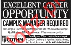 Latest College of Tourism & Hotel Management COTHM Management Posts Lahore 2025
