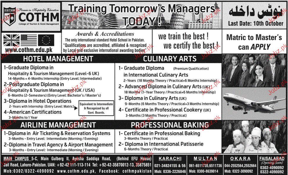 College of Toursim and Hotel Management Admission in Diploma in Hotel Management and Airline Management in Multan Read newspaper ad for exact details.