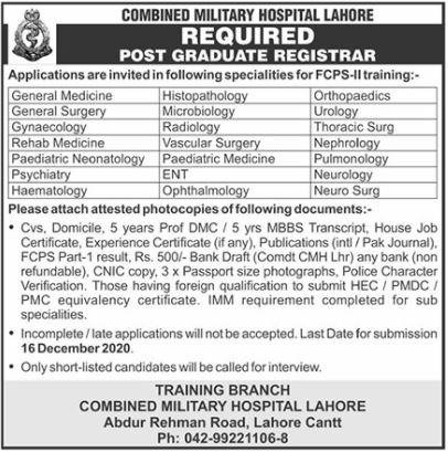 Combined Military Hospital CMH invites applications from medical, health, mbbs, doctors and experienced candidates for the posts of General Medicine Registrar, General Surgery Registrar, Gynaecology Registrar, Rehab Medicine Registrar, Paediatric Neonatology Registrar, Psychiatry Registrar, Haematology Registrar, Histopathology Registrar, Microbiology Registrar, Radiology Registrar, Vascular Surgery Registrar, Paediatric Medicine Registrar, ENT Registrar, Ophthalmology Registrar, Orthopaedics Registrar, Urology Registrar, Thoracic Surgery Registrar, Nephrology Registrar, Pulmonology Registrar, Neurology Registrar and Neuro Surgery Registrar in Lahore Cantt.