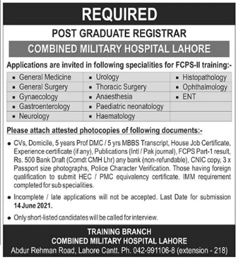 Vacancies in Combined Military Hospital CMH Advertisement May 2021