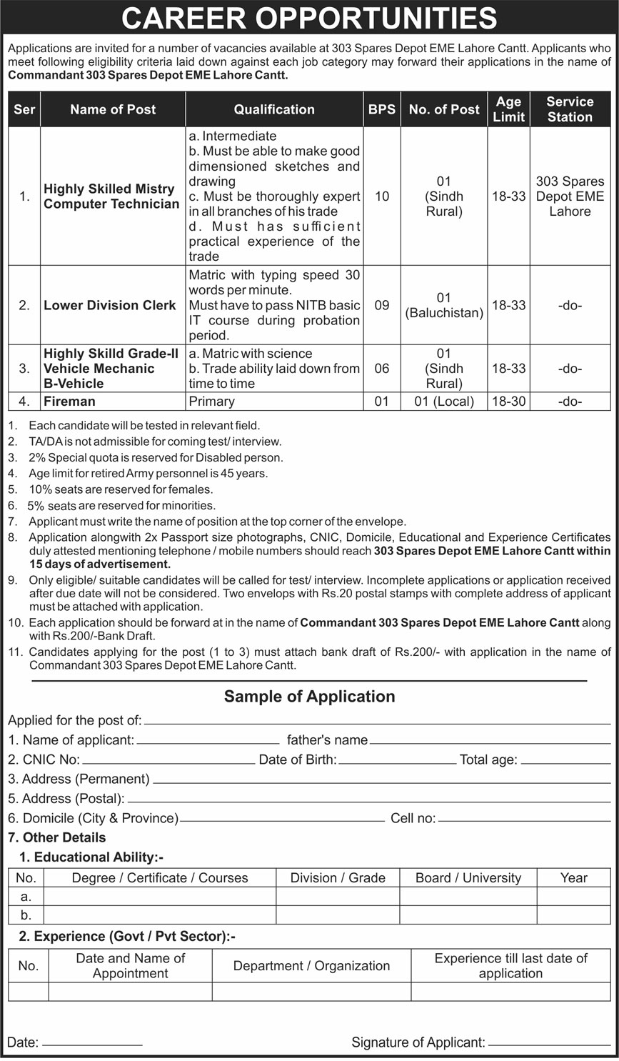 Commandant 303 Spares Depot EME Lahore Jobs 2021