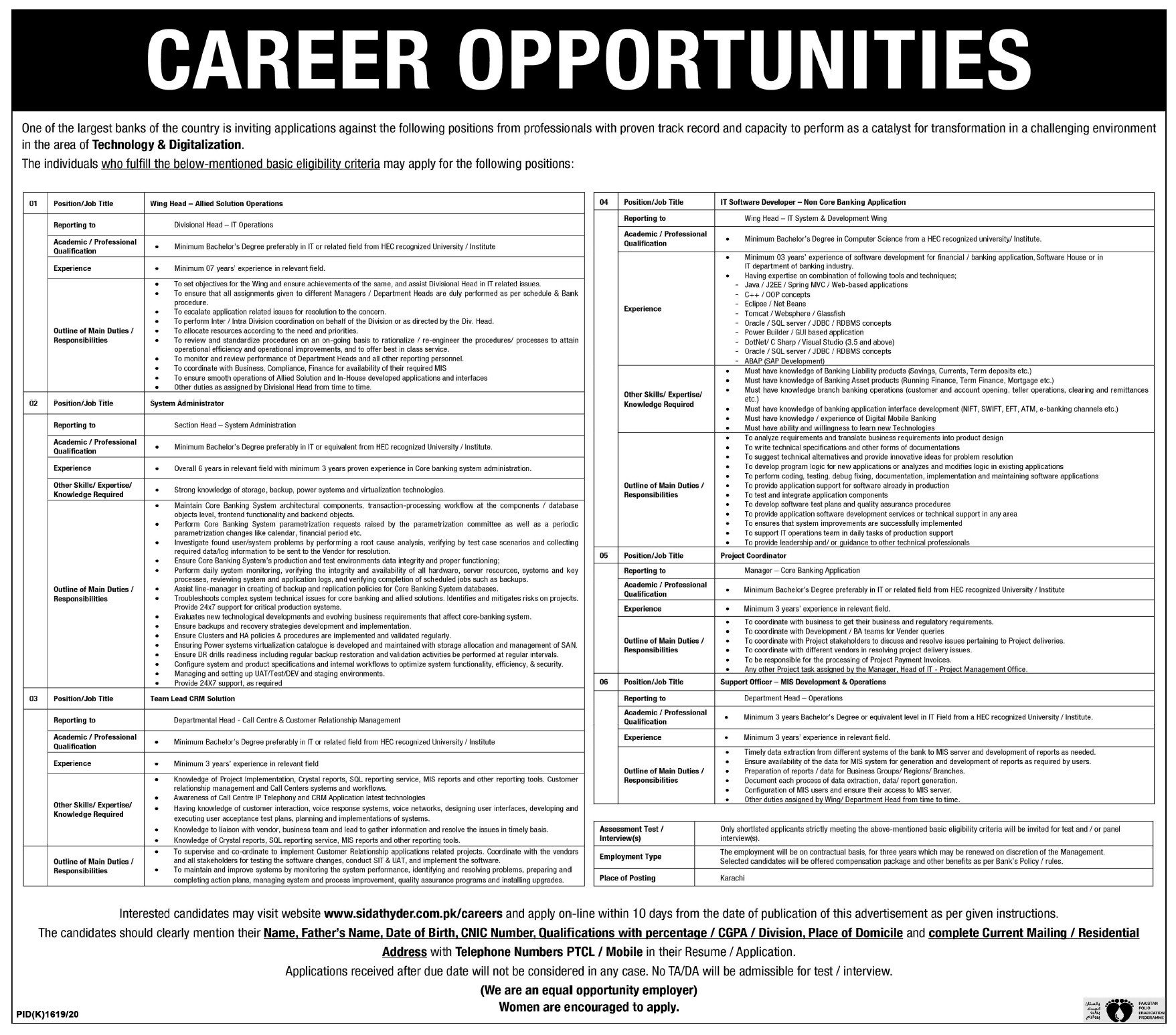 A leading and well known Commercial Bank requires the services of qualified and experienced candidates for the posts of Wing Head, System Administrator, Team Lead CRM Solution, IT Software Developer, Project Coordinator, Support Officer MIS Development and Operations in Karachi.