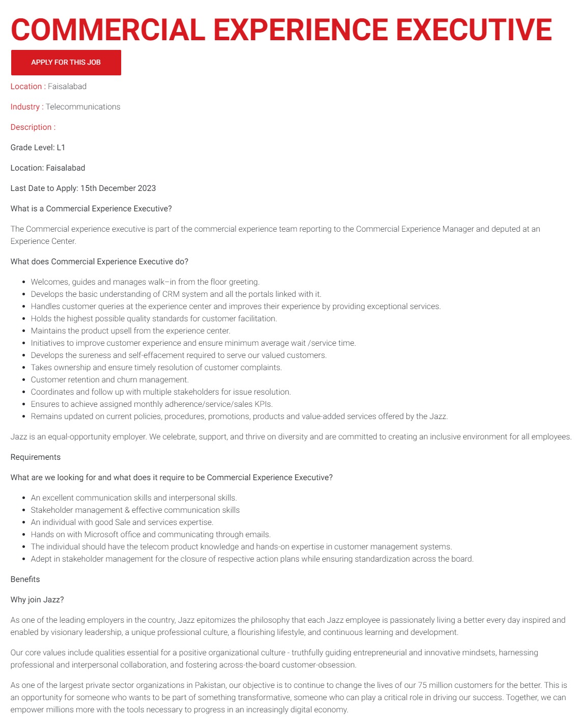Jazz Telecom jobs advertisement dated about 12 December 2023 in daily Other Newspaper invites application for the vacant post of commercial experience executive in Faisalabad, faisalabad Punjab Pakistan. Master and Bachelor etc. educational qualification will be preferred.