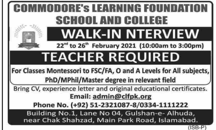Commodore Learning Foundation School and College is hiring qualified and hardworking candidates for the posts of Montessori Teacher, English Teacher, Chemistry Teacher, Physics Teacher, Computer Teacher, Maths Teacher, O and A Levels Subject Teacher in Islamabad.
