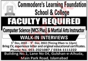 Commodore Learning Foundation jobs advertisement dated about 4 December 2022 in daily Jang Newspaper invites application for the vacant post of teacher, lecturer and martial arts instructor in Islamabad, islamabad Islamabad Pakistan. Educational qualifications required Master, MA, MCS and M.sc etc.