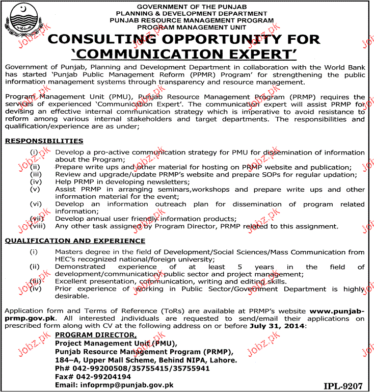 Apply as per details in job advertisement. Login to view further details of how to apply via https://www.jobz.pk online.