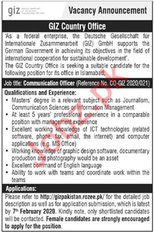 Vacancies in GIZ Pakistan Advertisement January 2020
