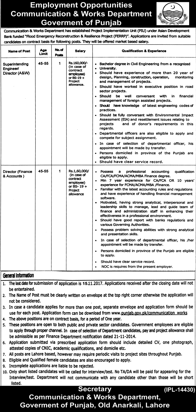 Latest Communication and Works Department Engineering Posts Lahore 2025