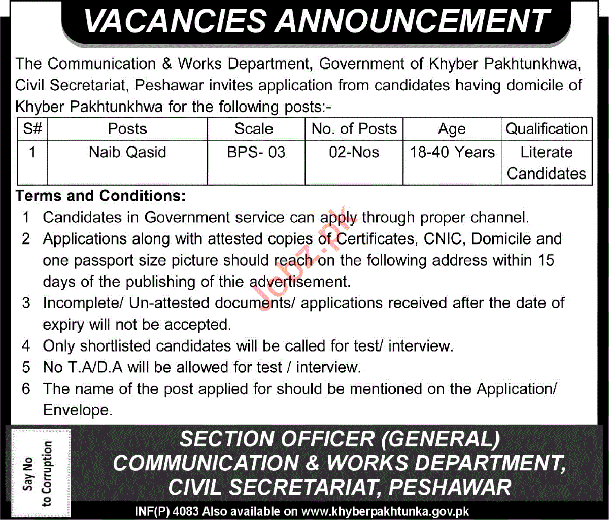 Apply as per details in job advertisement. Login to view further details of how to apply via https://www.jobz.pk online.