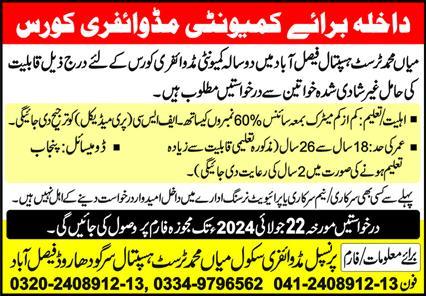 Midwifery School Mian Muhammad Trust Hospital admissions 2024 for Community Midwifery Course has been announced. Eligible students can apply for academic admissions 2024 in Midwifery School Mian Muhammad Trust Hospital Faisalabad Punjab Pakistan for Medical College. Eligible candidates for admissions in Course can apply as per Private institute criteria and before closing date 22 July 2024 after reading advertisement online. Read newspaper ad for exact details.