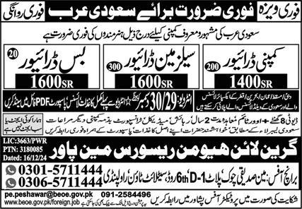 Green Line Human Resource Manpower jobs advertisement dated about 27 December 2024 in daily Express Newspaper invites application for the vacant post of salesman driver, company driver and bus driver in Saudi Arabia, saudi arabia Saudi Arabia. Persons with Primary, Middle, Intermediate and Matric etc. education can apply.
