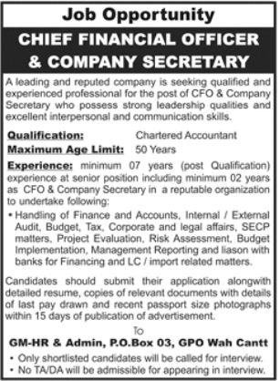 Private Company invites applications for job positions advertised in daily Jang dated 13 March 2022 for following vacancies in Wah Cantt, wah cantt Punjab Pakistan.