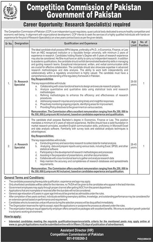 Competition Commission of Pakistan Islamabad, islamabad Islamabad Pakistan invites applications from eligible candidates for the post of research specialist as per advertisement of December 27, 2023 published in daily The News Newspaper. Preferred Education is Bachelor, MS and Master etc.