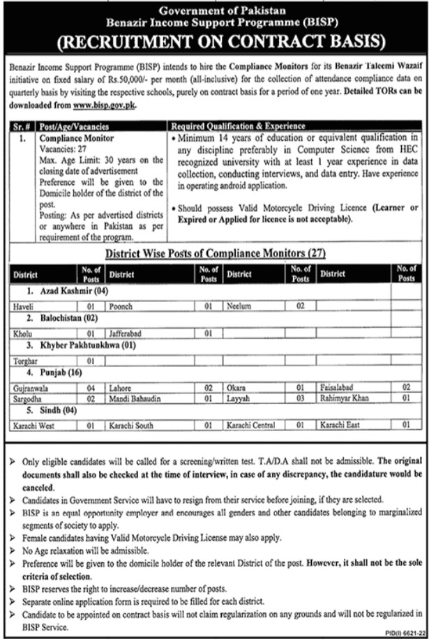 Benazir Income Support Programme BISP Lahore, lahore, okara, layyah, torghar, karachi, kohlu, rahim yar khan, mandi bahauddin, neelum valley, gujranwala, haveli, sargodha, poonch, jaffarabad and faisalabad Punjab Pakistan invites applications from eligible candidates for the post of compliance monitor as per advertisement of May 2, 2023 published in daily Jang Newspaper. Persons with Bachelor etc. education can apply.
