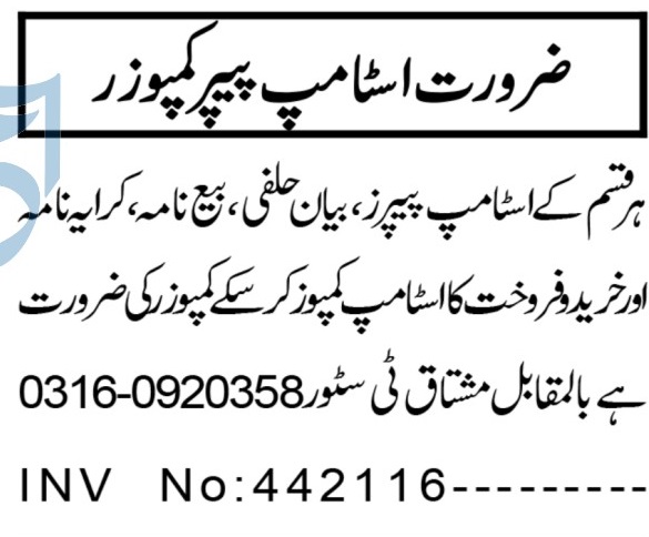 Private Company Peshawar, peshawar Khyber Pakhtunkhwa KPK Pakistan invites applications from eligible candidates for the post of stamp paper composer and composer as per advertisement of May 31, 2025 published in daily Aaj Newspaper. Persons with Bachelor and Intermediate etc. education can apply.