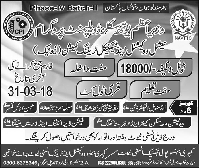 National Vocational & Technical Training Compree Hesno Polytechnic Institute Admission in Courses in Industrial Electricians and Civil Surveyor Courses in Sargodha. Read newspaper ad for exact details.