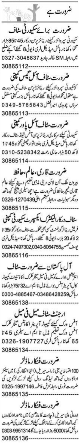 Private Multan, multan Punjab Pakistan invites applications from eligible candidates for the post of hafiz, office boy, clerk, computer operator, retired person, manager, accountant, aalim, actor, accounts manager, field staff, office staff, security supervisor, retired government staff, model, computer call operator and qari as per advertisement of November 14, 2023 published in daily Express Newspaper. Persons with Master, Middle, Intermediate, Bachelor and Matric etc. education can apply.