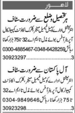 Computer Call Operator & Clerk Jobs 2025 In Lahore