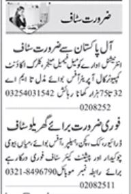 Private Company Islamabad, Islamabad Pakistan invites applications from eligible candidates for the post of chowkidar, computer call operator, cook, clerk, kitchen helper, patient care, husband wife, female manager, manager, accountant, office boy and driver as per advertisement of August 2, 2025 published in daily Dunya Newspaper. Preferred Education is Middle, BA, Intermediate, Matric, Bachelor and B.com etc.