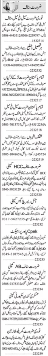 Private Company jobs advertisement dated about 22 March 2023 in daily Dunya Newspaper invites application for the vacant post of naik, havaldar, accountant, subedar, cook, security supervisor guard, office field supervisor, chowkidar, aya, security guard, teacher, clerk, subedar major, call computer operator, driver, supervisor, cook helper, computer call operator, public relation officer, watchman, manager, office boy, patient care, call operator, patwari, barber, office staff, helper, husband wife and pro in Islamabad, rawalpindi Islamabad Pakistan. Matric, Intermediate, Middle and Bachelor etc. educational qualification will be preferred.