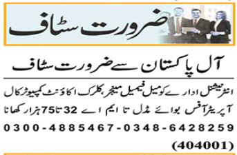 Vacant posts including female manager, manager, clerk, computer call operator, office boy and accountant are announced in Private Company Lahore, lahore Punjab Pakistan as per 9 May 2025 advertisement in daily Nawaiwaqt Newspaper. Candidates with Middle, Intermediate, BA, B.com, Matric and Bachelor etc. educational background will be preferred.