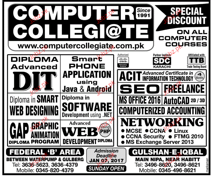 Computer Collegiate Admission in DIT and Courses in karachi. Read newspaper ad for exact details.