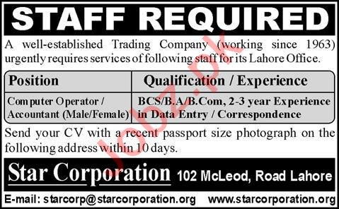 Computer Operator & Accountant Jobs 2020 In Star Corp