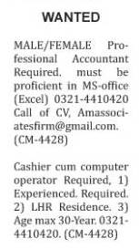 Private Company Lahore, lahore Punjab Pakistan invites applications from eligible candidates for the post of cashier, accountant and computer operator as per advertisement of July 10, 2024 published in daily Nawaiwaqt Newspaper. Persons with Bachelor, Intermediate and BA etc. education can apply.